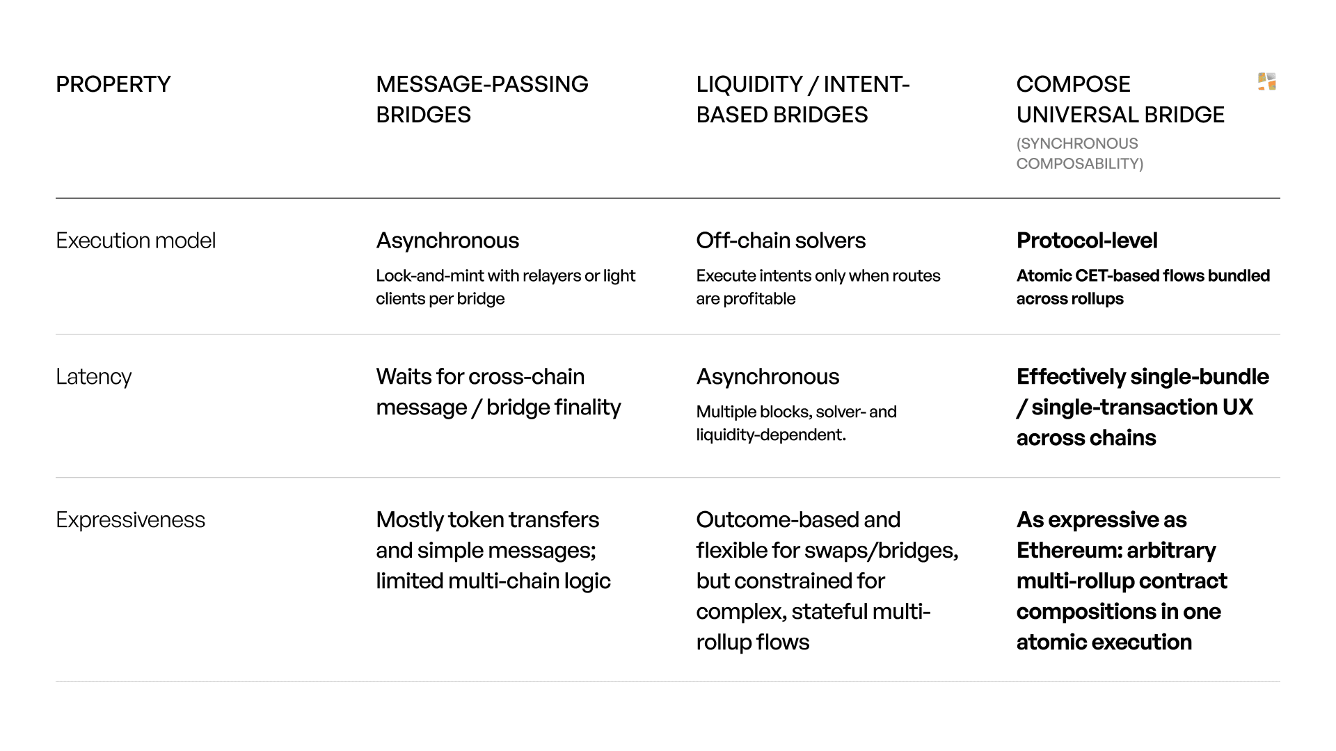 Think of the universal bridge as the asset side of Compose’s architecture. The universal bridge handles tokens and liquidity; the Shared Publisher handles execution and synchronous composability.